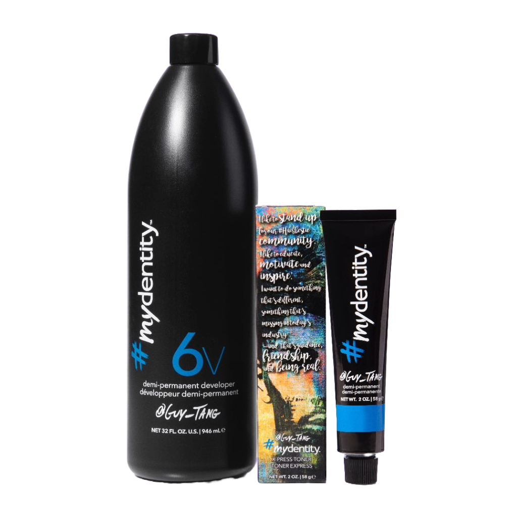 Mélangez une part de #mydentity @Guy_Tang X-Press Toner Color Crème avec deux parts de #mydentity @Guy_Tang Demi-Permanent Developeur 6V (1:2).